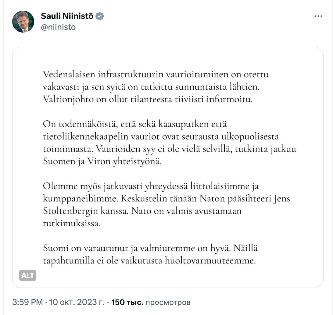 "Ущерб подводной инфраструктуре считается серьезным, и его причины расследуются с воскресенья. Вполне вероятно, что как газопровод, так и кабель повреждены в результате внешнего воздействия. Эти события никак не повлияют на безопасность поставок", - заявил президент Финляндии.