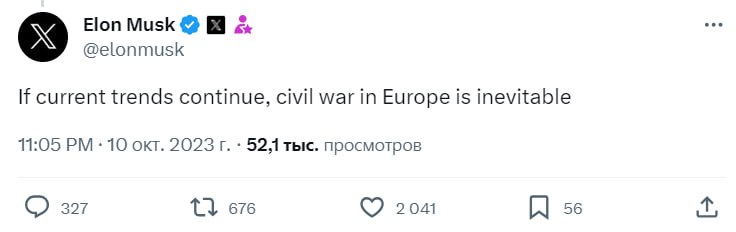 "Если нынешние тенденции сохранятся, гражданская война в Европе неизбежна", — считает Маск.