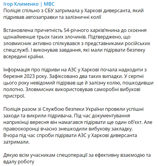 В Харькове задержали 54-летнего местного жителя, взрывавшего автозаправки и железнодорожные пути. Фото: Telegram