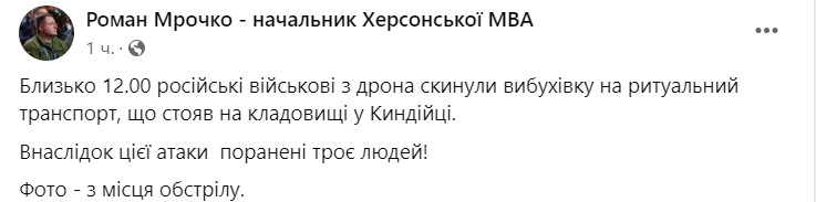 "Около 12:00 российские военные с дрона сбросили взрывчатку на ритуальный транспорт, стоявший на кладбище в Киндийке", - написал Мрочко.