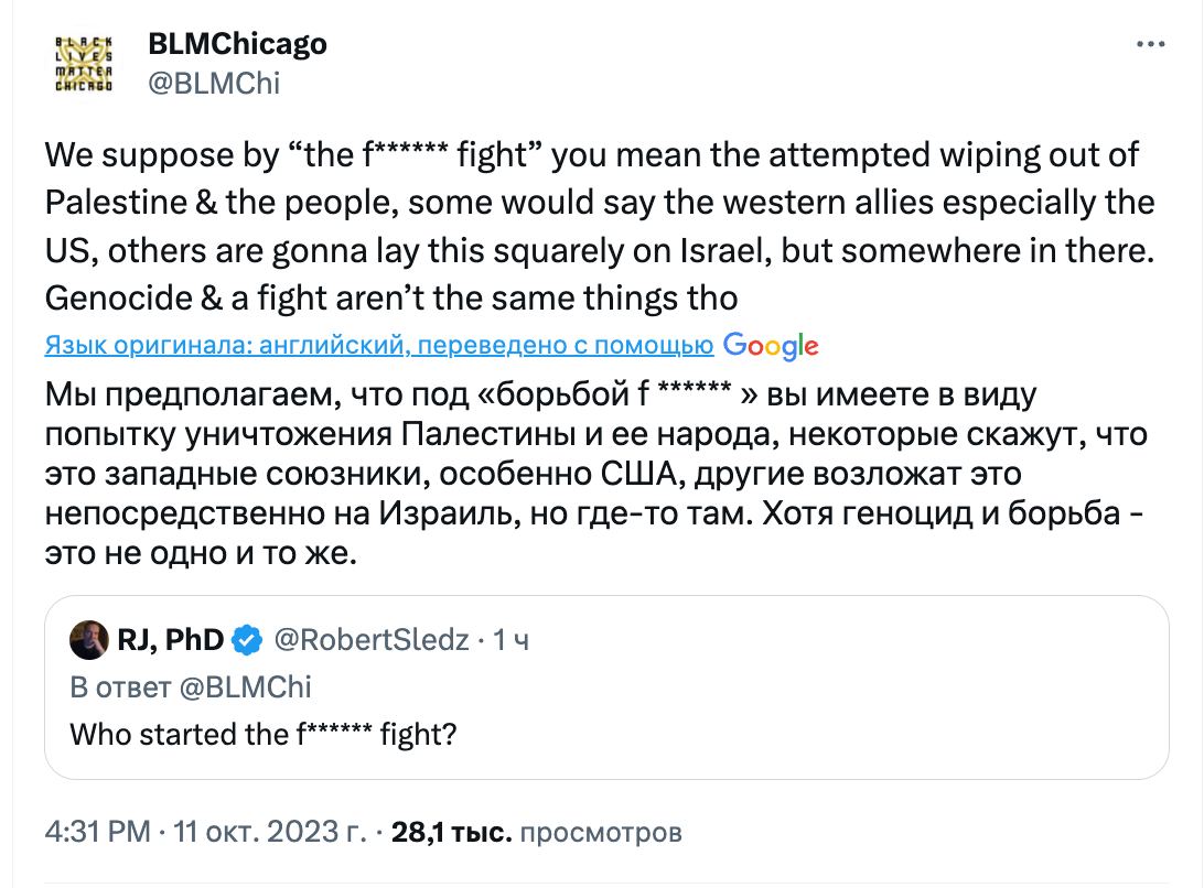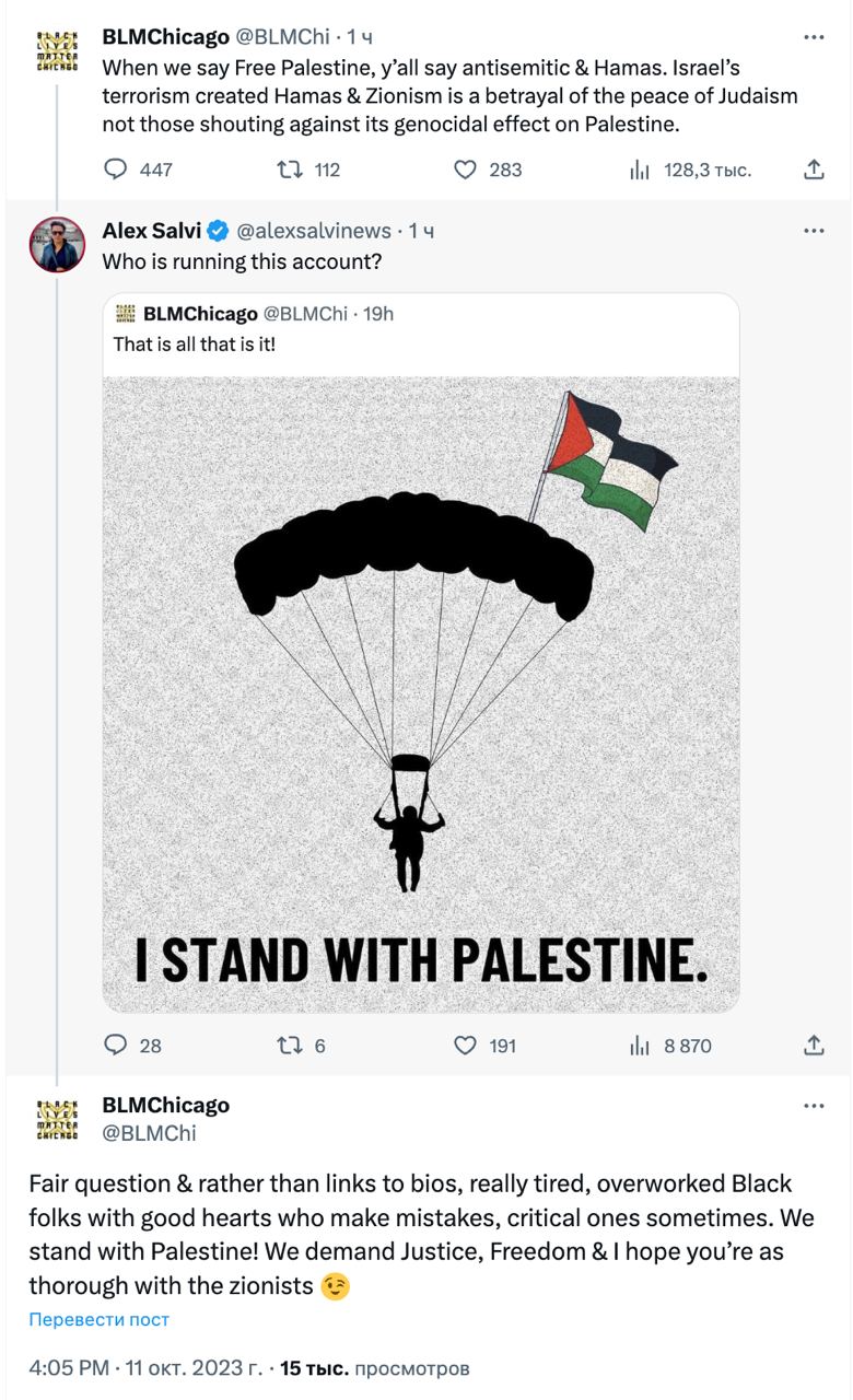 Сначала активисты BLM запостили в Х картинку с диверсантом ХАМАС на параплане и подписью: "Я поддерживаю Палестину". Затем ее удалили, а пользователи задали вопрос, кто ведет этот аккаунт. В BLM ответили, что иногда "допускают ошибки", но Палестину все-таки поддерживают.
