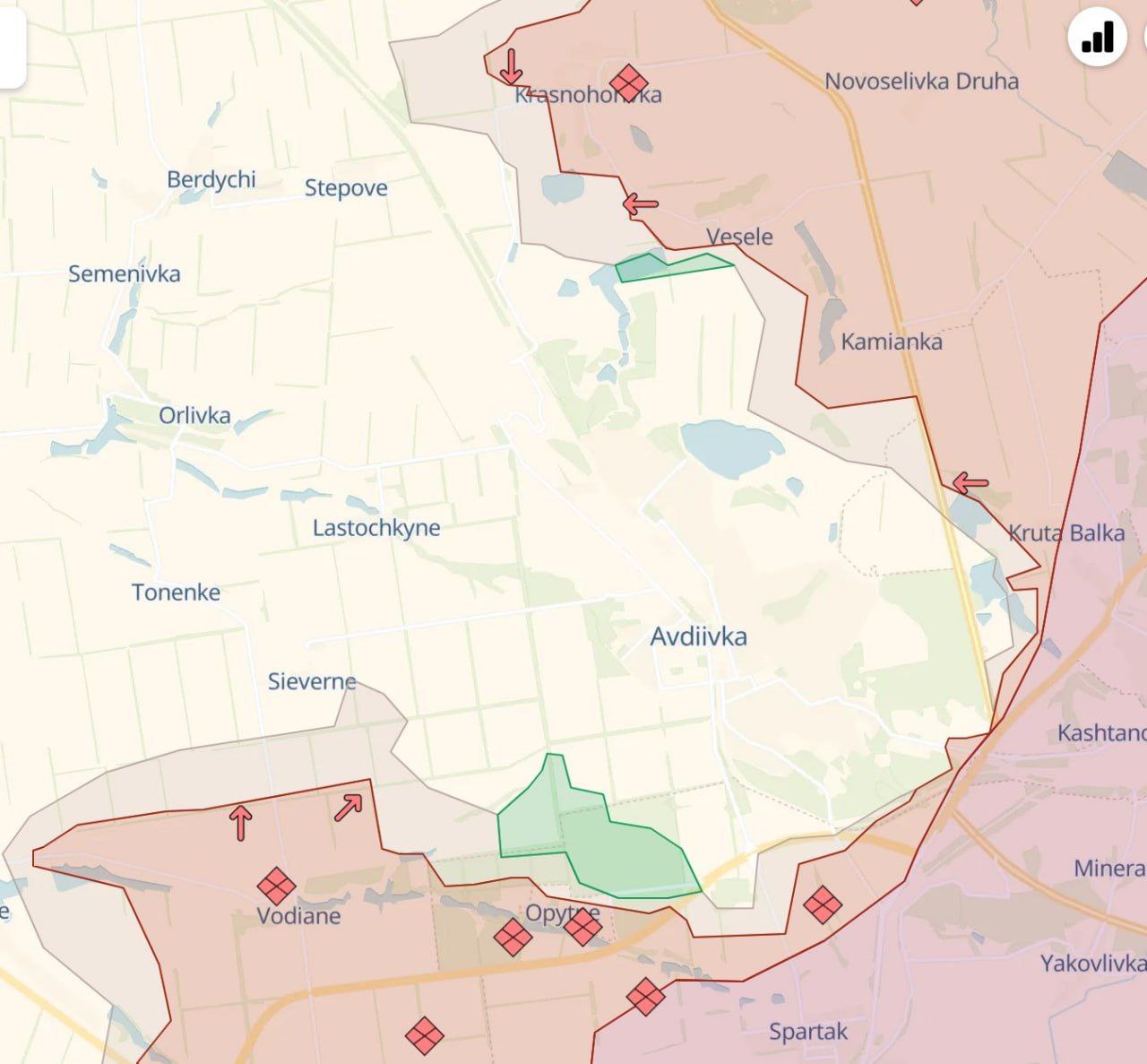 При этом российские паблики с ночи утверждают, что террикон, который расположен рядом с промзоной Авдеевского коксохимзавода, уже захвачен россиянами. Заявляется, что бои за эту высоту периодически шли всю войну, поскольку этой удобная точка, с которой простреливается северо-запад Авдеевки.