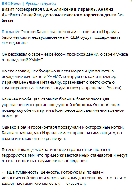 По словам Блинкена, которые цитирует ВВС, Израиль имеет право на самооборону, но важно и то, как именно он его реализует. Госсекретарь сказал, что демократические страны отличаются от террористов тем, что придерживаются иных стандартов и несут ответственность в случае их несоблюдения.