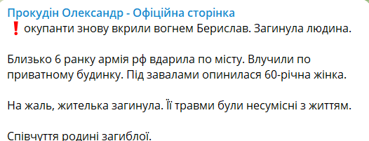 08:40 Сегодня утром российские войска в очередной раз ударили по Бериславу Херсонской области. Погиб человек.