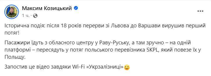 "Историческое событие: после 18 лет перерыва из Львова в Варшаву отправился первый поезд!", - написал Козицкий.