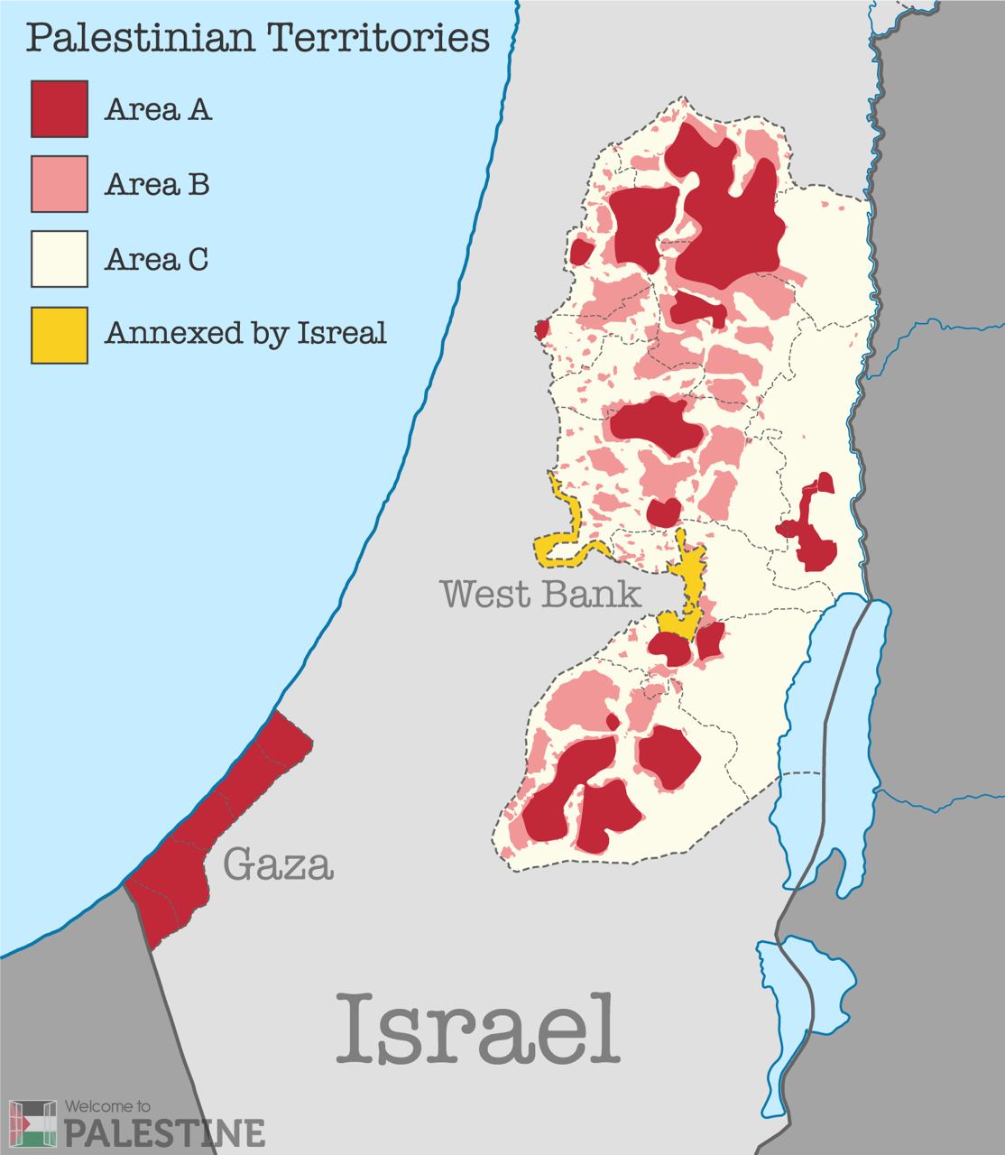 Палестинская автономия с 1994 года. Зона А - территории под политическим и силовым контролем ПНА (при этом, сектор Газа находится де-факто под контролем ХАМАС), зона В - территории под политическим контролем ПНА, но силовым контролем Израиля, зона С - территории под полным контролем Израиля).