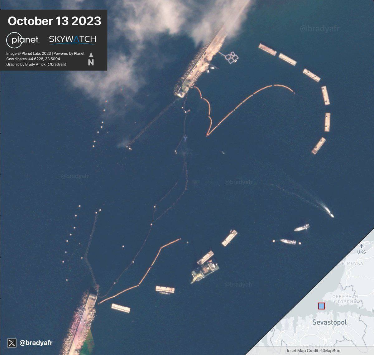 Как мы уже рассказывали, поражение кораблей могло стать следствием использования Украиной новых подводных дронов. Видимо, поэтому россияне установили заграждение на входе в Севастопольскую бухту, о чем свидетельствует снимок со спутника.