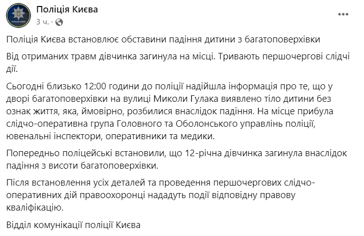 "Сегодня, 15 октября, в 12:00 в полицию поступила информация о том, что во дворе многоэтажки на улице Николая Гулака обнаружено тело ребенка без признаков жизни", - говорится в сообщении.
