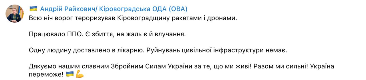 Об этом сообщил глава Кировоградской областной военной администрации Андрей Райкович в своем Telegram-канале.