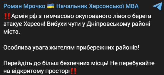 "Армия России с временно оккупированного левого берега атакует Херсон! Взрывы слышны в Днепровском районе города", - написал Мрочко.