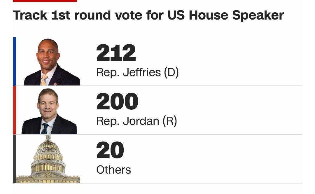 Это был первый тур голосования в Палате представителей. Помимо Джордана, на пост спикера выдвигался также демократ Хаким Джеффрис, он набрал 212 голосов своих однопартийцев.