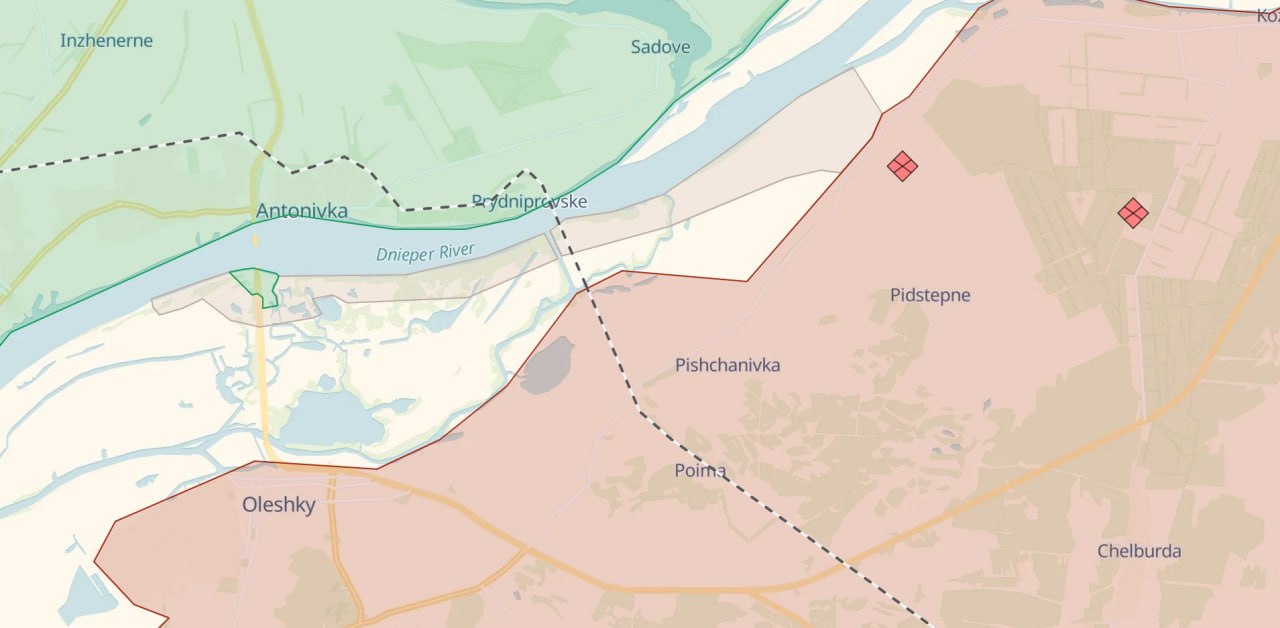 Заявлялось, что вчера ВСУ форсировали Днепр в районе Антоновского железнодорожного моста (он восточнее автомобильного) и высадились на левом берегу у сел Пойма и Песчановка. Это участок восточнее Олешек у дороги в сторону Новой Каховки. Сообщалось, что украинские части овладели частью Песчановки.