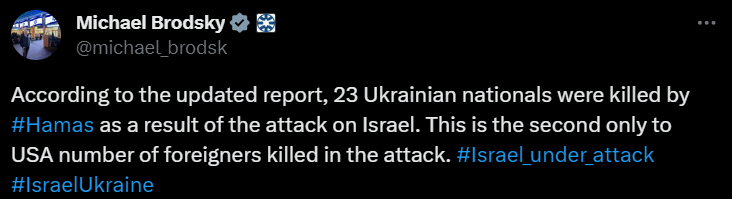 "Согласно обновленному отчету, в результате нападения ХАМАСа на Израиль погибли 23 гражданина Украины. Это второе после США количество погибших иностранцев во время нападения", - написал Бродский.