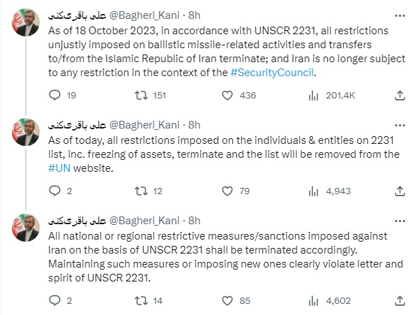 "На сегодняшний день все ограничения, наложенные на физических и юридических лиц, упомянутых в резолюции 2231, в том числе положения о заморозке иранских активов, завершают свое действие, и их список будет удален с сайта ООН. Также утрачивают свою силу санкции, несправедливо наложенные на импорт и экспорт баллистических ракет в и из Ирана. Все национальные и региональные ограничения, введенные против исламской республики на основании резолюции 2231, также должны быть отменены. Сохранение в силе этих мер прямо нарушает положения самой резолюции", - написал Багери Кяни.