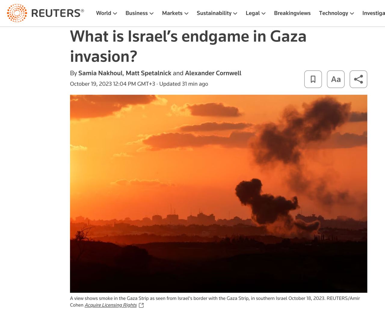 Израильские чиновники анонимно заявили, что у них нет четкого представления о том, как может выглядеть послевоенное будущее Газы. США обеспокоены отсутствием этого плана. Послевоенный план для сектора Газа обсуждался кроме прочих тем в ходе визитов в Израиль госсекретаря  Энтони Блинкена и министра обороны Ллойда Остина на прошлой неделе.