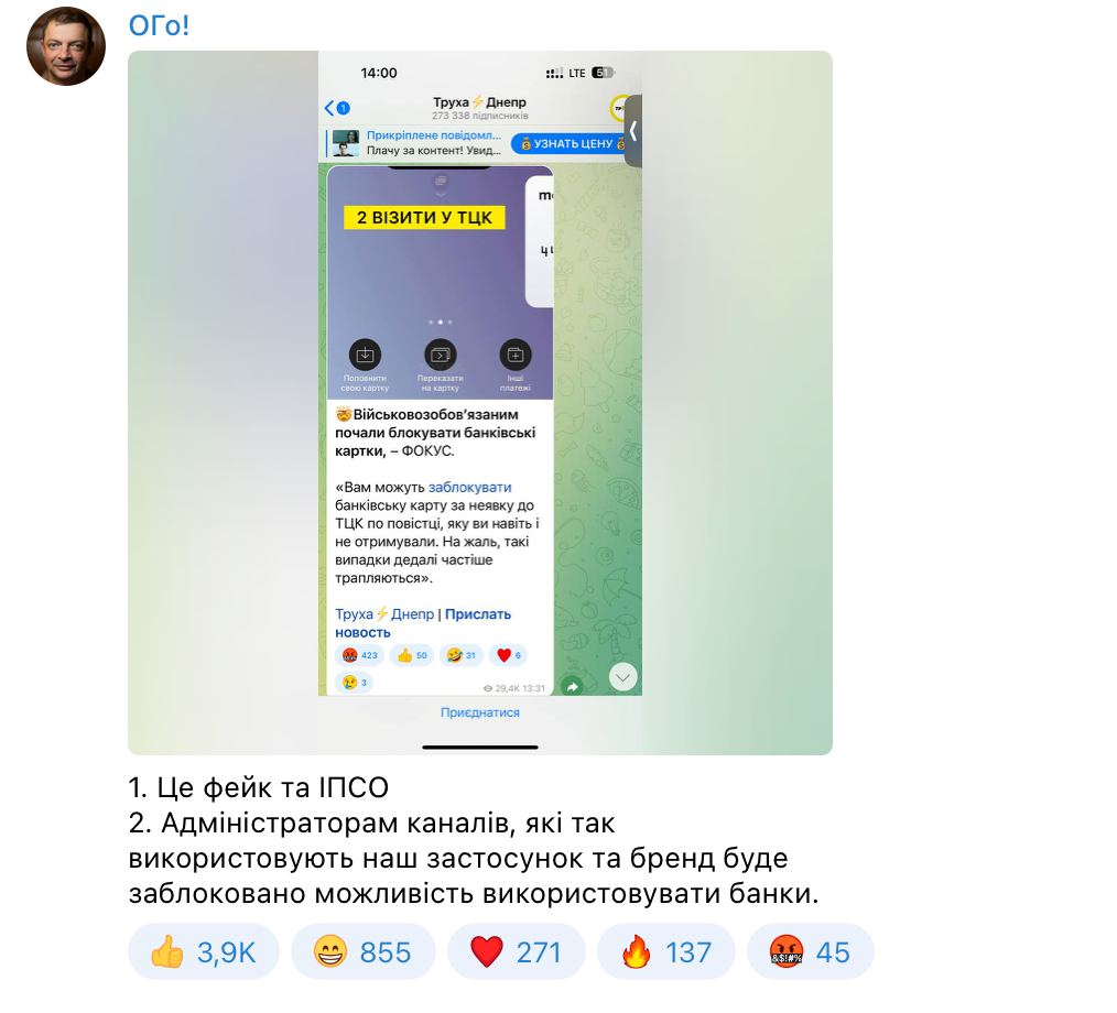 "1. Это фейк и ИПСО. 2. Администраторам каналов, которые так используют наше приложение и бренд (размещают скриншот "Монобанка" в качестве иллюстрации - Ред.), будет заблокирована возможность использовать банки", - написал Гороховский.