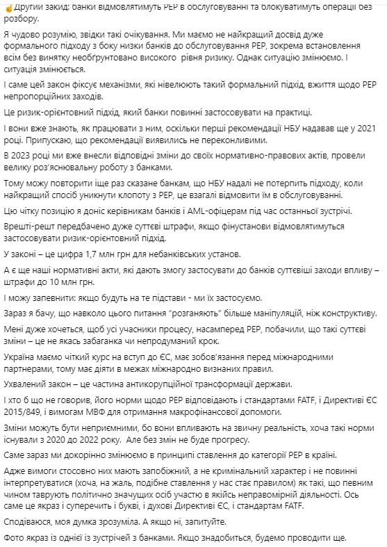 "Даже если вы подпадаете под усиленные процедуры финансового мониторинга, это НЕ означает, что они бессрочны. По прошествии 12 месяцев после того, как PEP (политически значимая личность) перестала выполнять значимые публичные функции и банк убедился в отсутствии рисков, присущих PEP (уровень влияния, объем полномочий в прошлом, соотношение между прошлыми и текущими полномочиями), ее операции понятны, и в отношении любого другого клиента будут применяться обычные процедуры финансового мониторинга. Никто не собирается наказывать PEP какими-то пожизненными усиленными проверками", – написал Пышный.