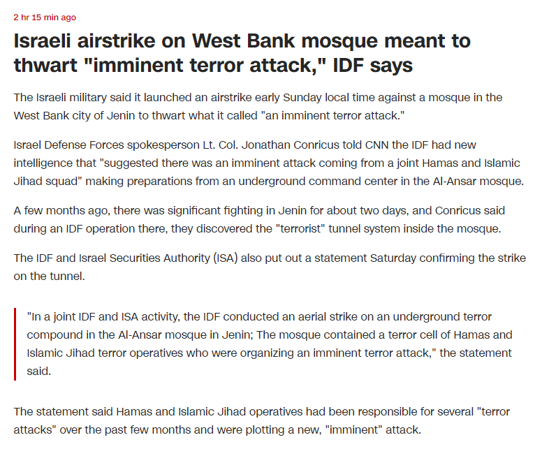 Израильские военные заявили, что рано утром в воскресенье нанесли авиаудар по мечети в городе Дженин на Западном берегу реки Иордан, чтобы предотвратить "неминуемую террористическую атаку".