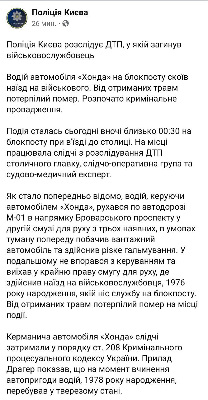 Напомним, в Киеве ночью 25 июля водитель сбил двух военнослужащих, которые дежурили на блокпосту. Один мужчина скончался.