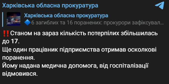 Также в прокуратуре сообщили, что количество пострадавших увеличилось до 17 человек. Еще один работник предприятия получил осколочные ранения.