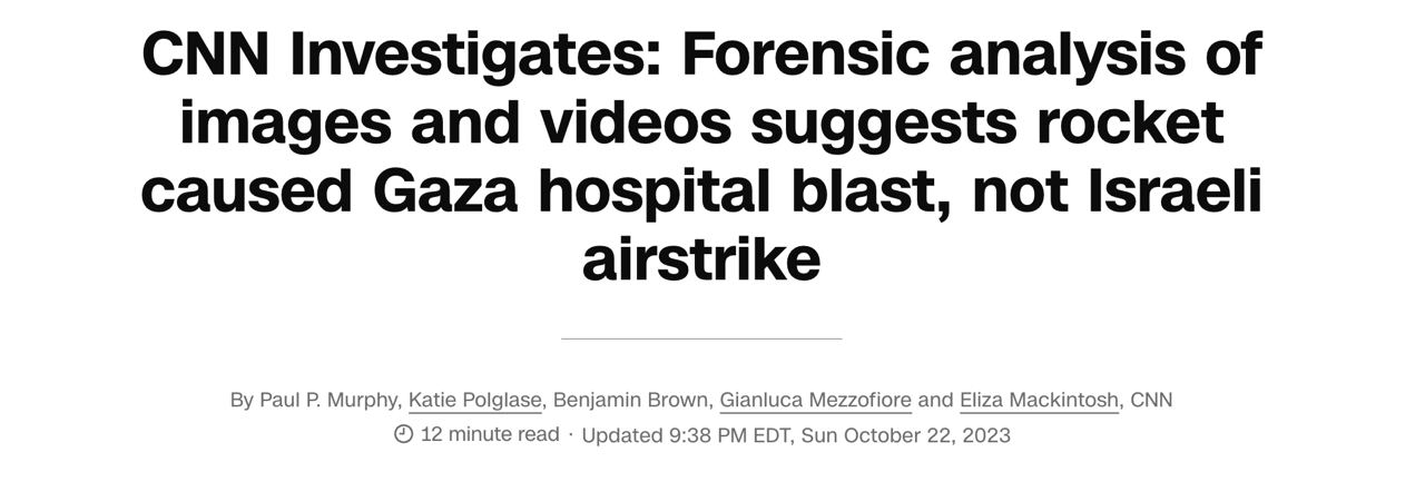 По их оценке, палестинская ракета по какой-то причине вышла из строя, развалилась в воздухе, и ее корпус врезался в автостоянку. Там загорелись остатки топлива и воспламенили автомобили и другое топливо в больнице, что вызвало большой взрыв.