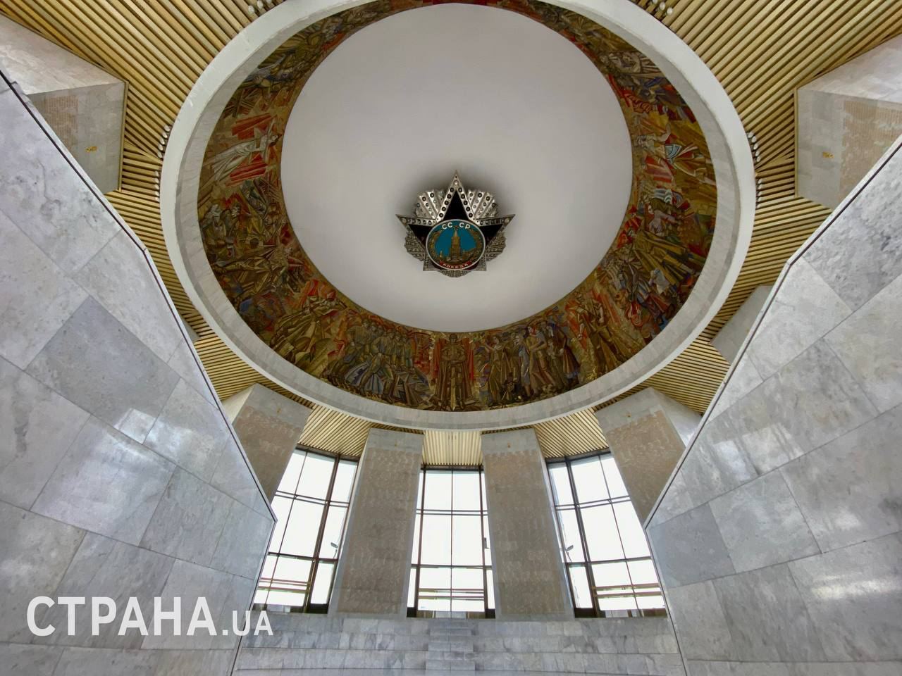 К слову, у подножья монумента Родина Мать расположен зал Славы, на потолке которого установлен Орден Победы и панно с надписью СССР.