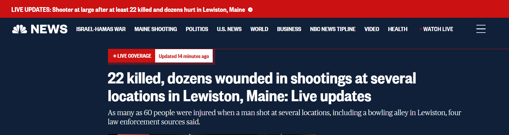По меньшей мере 22 человека были убиты, сообщил NBC News источник в полиции Льюистона. По данным правоохранительных органов, в нескольких местах получили ранения от 50 до 60 человек.