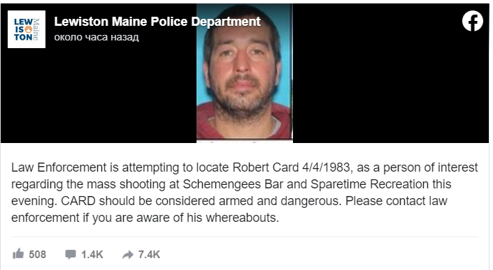 Представители правоохранительных органов штата Мэн заявили, что подозреваемый - 40-летний мужчина по имени Роберт Кард.
