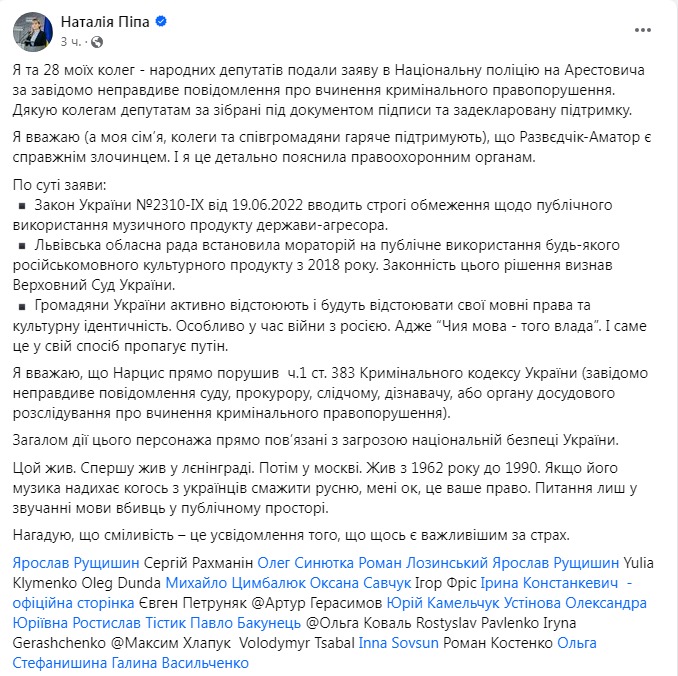Заявление стало ответом Пипы на поданный Арестовичем иск против нее по делу об исполнении песен рок-легенды Виктора Цоя молодым одесситом во Львове.
