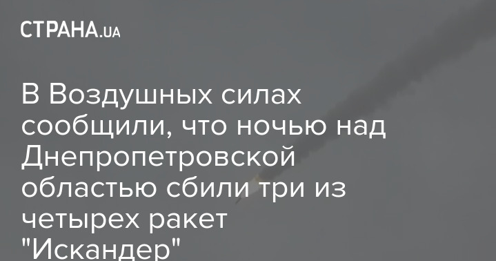 Сегодня ночью россияне атаковали Днепропетровскую область четырьмя крылатыми ракетами наземного базирования "Искандер-К", три из которых были сбиты силами ПВО.