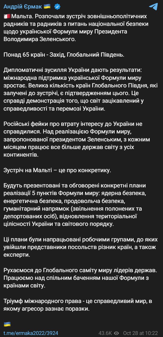 Сегодня, 28 октября, на Мальте стартовал третий мирный саммит по Украине, на котором присутствуют представители более 65 стран.