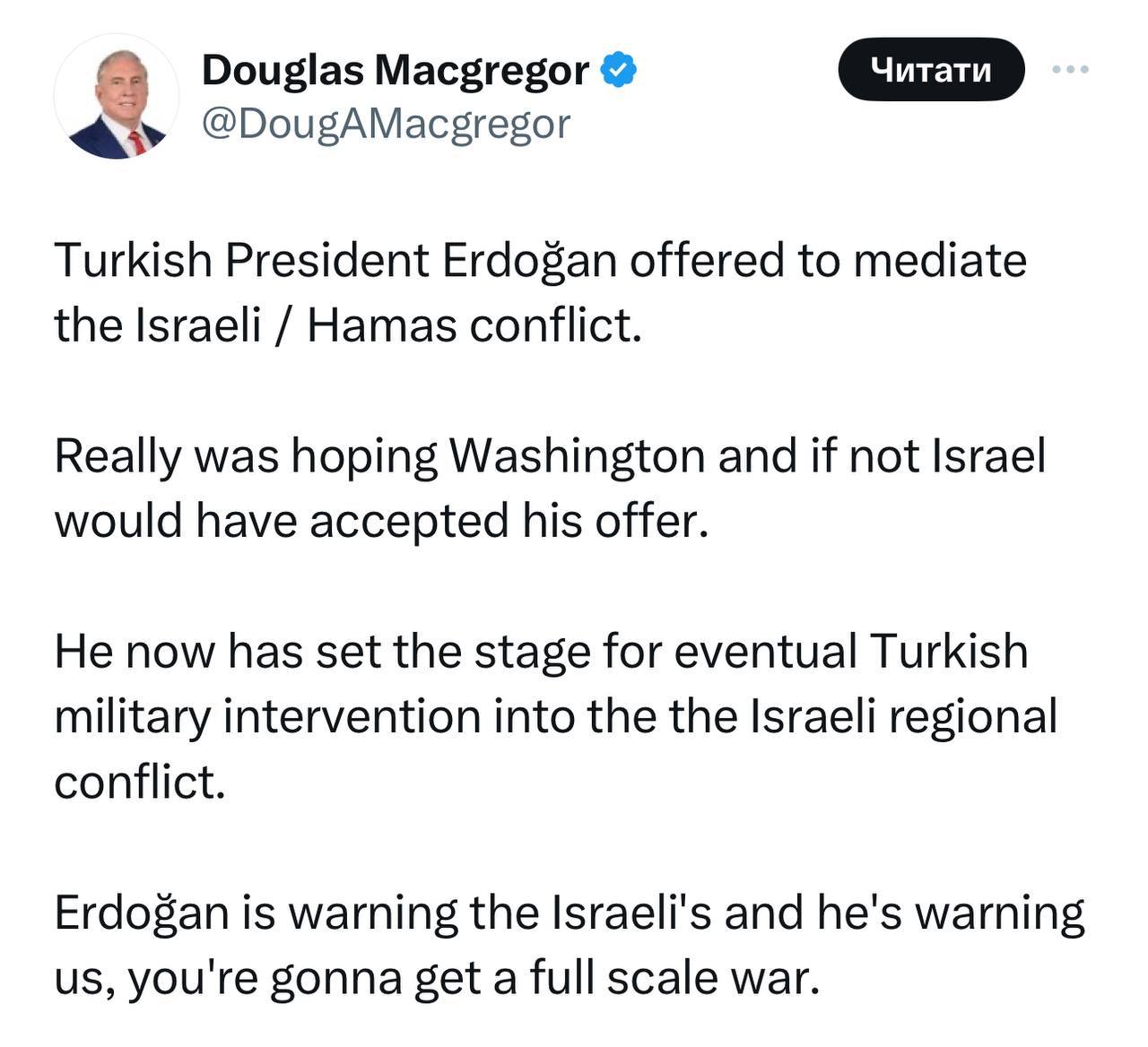 "Эрдоган подготовил почву для возможного военного вмешательства Турции в израильский региональный конфликт. Он предупреждает израильтян и нас (США), что будет полномасштабная война", – пишет военный эксперт.