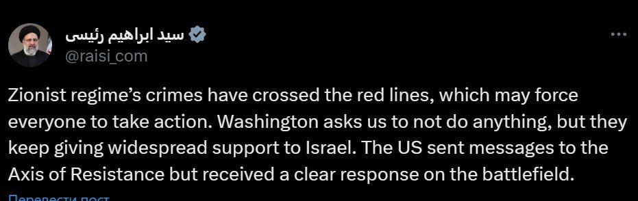 "Преступления сионистского режима перешли красные линии, что может вынудить каждого принять меры. Вашингтон просит нас ничего не предпринимать, но они продолжают оказывать широкую поддержку Израилю", - сказал Раиси.