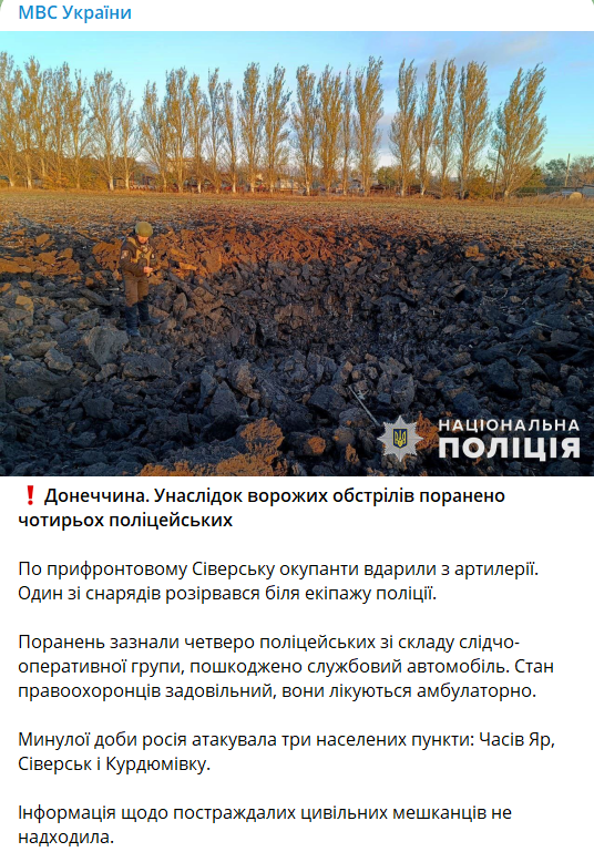 В результате обстрела РФ в Донецкой области ранены четыре полицейских. По прифронтовому Северску оккупанты ударили из артиллерии, один из снарядов разорвался у экипажа полиции