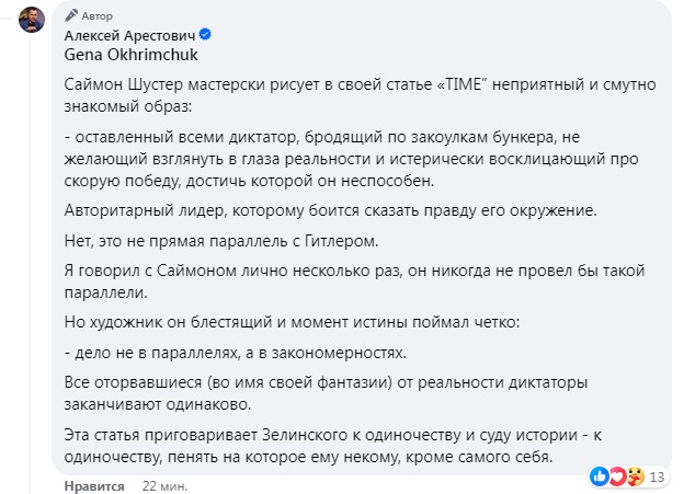 Что касается самой статье в Timе, то Арестович охарактеризовал ее так: "Саймон Шустер мастерски рисует в своей статье для Timе неприятный и смутно знакомый образ: оставленный всеми диктатор, бродящий по закоулкам бункера, не желающий взглянуть в глаза реальности и истерически восклицающий про скорую победу, достичь которой он неспособен. Авторитарный лидер, которому боится сказать правду его окружение. Нет, это не прямая параллель с Гитлером. Я говорил с Саймоном лично несколько раз, он никогда не провел бы такой параллели".