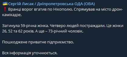 Сегодня с утра Никополь атаковали дроном-камикадзе, погибла 59-летняя женщина. Повреждено частное предприятие.
