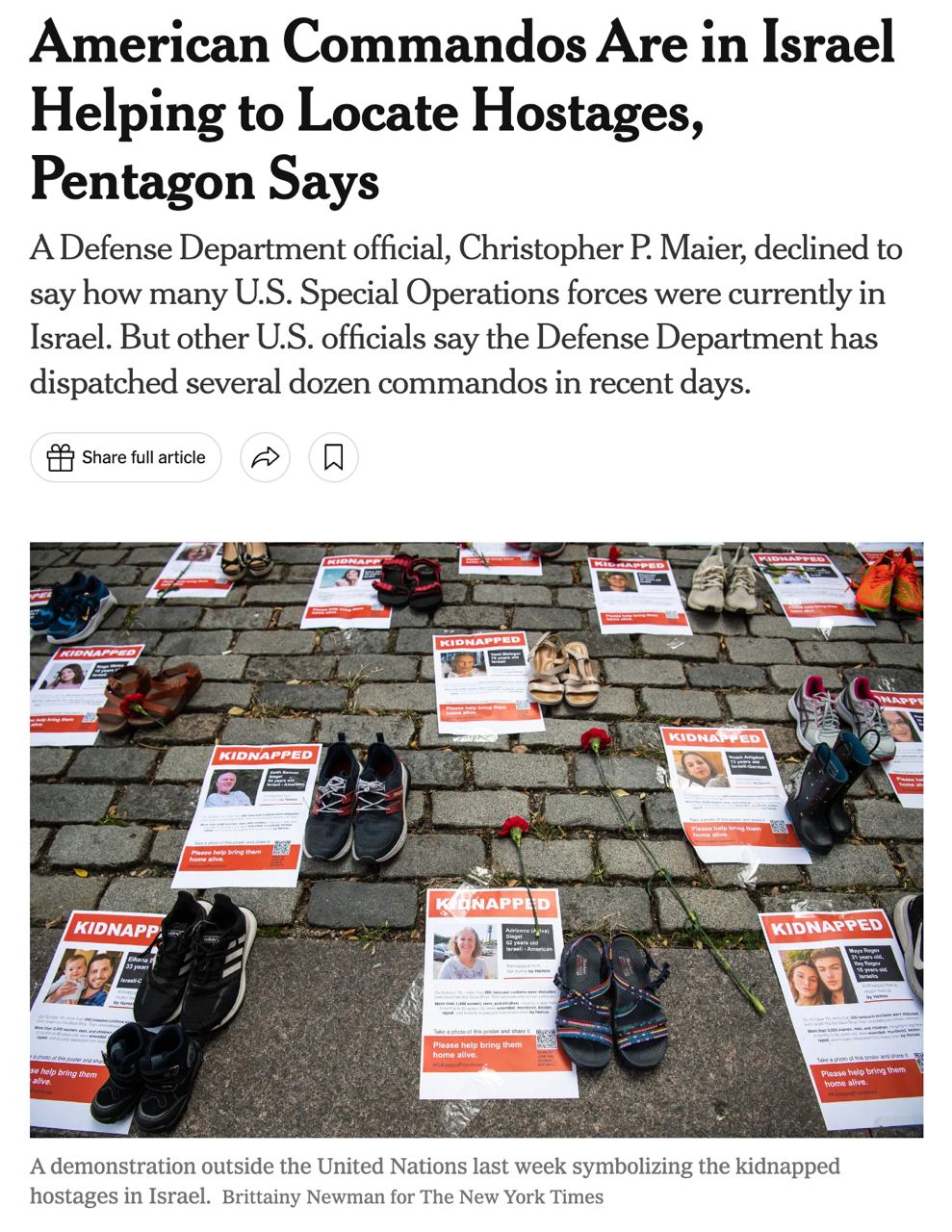 Представитель Пентагона Кристофер Майер сообщил, что американский спецназ прибыл в Израиль для помощи в поиске заложников.