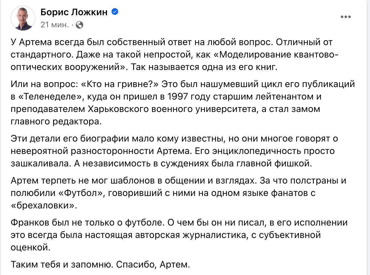"Его энциклопедичность просто зашкаливала. А независимость в суждениях была главной фишкой. Артем терпеть не мог шаблонов в общении и взглядах. За что полстраны и полюбили "Футбол", говоривший с ними на одном языке фанатов с "брехаловки". Франков был не только о футболе. О чем бы он ни писал, в его исполнении это всегда была настоящая авторская журналистика, с субъективной оценкой", - поделился воспоминаниями о Франкове Ложкин.