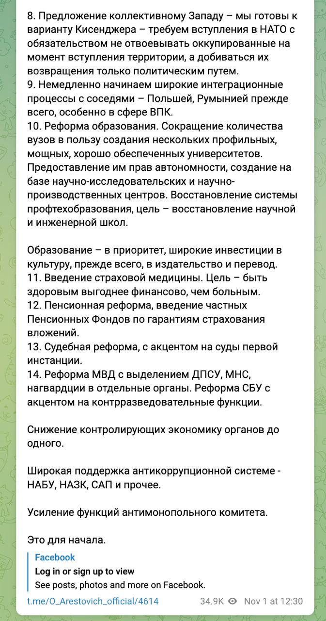 Ушедший в оппозицию к Владимиру Зеленскому бывший советник Офиса президента Алексей Арестович опубликовал свою политическую программу.