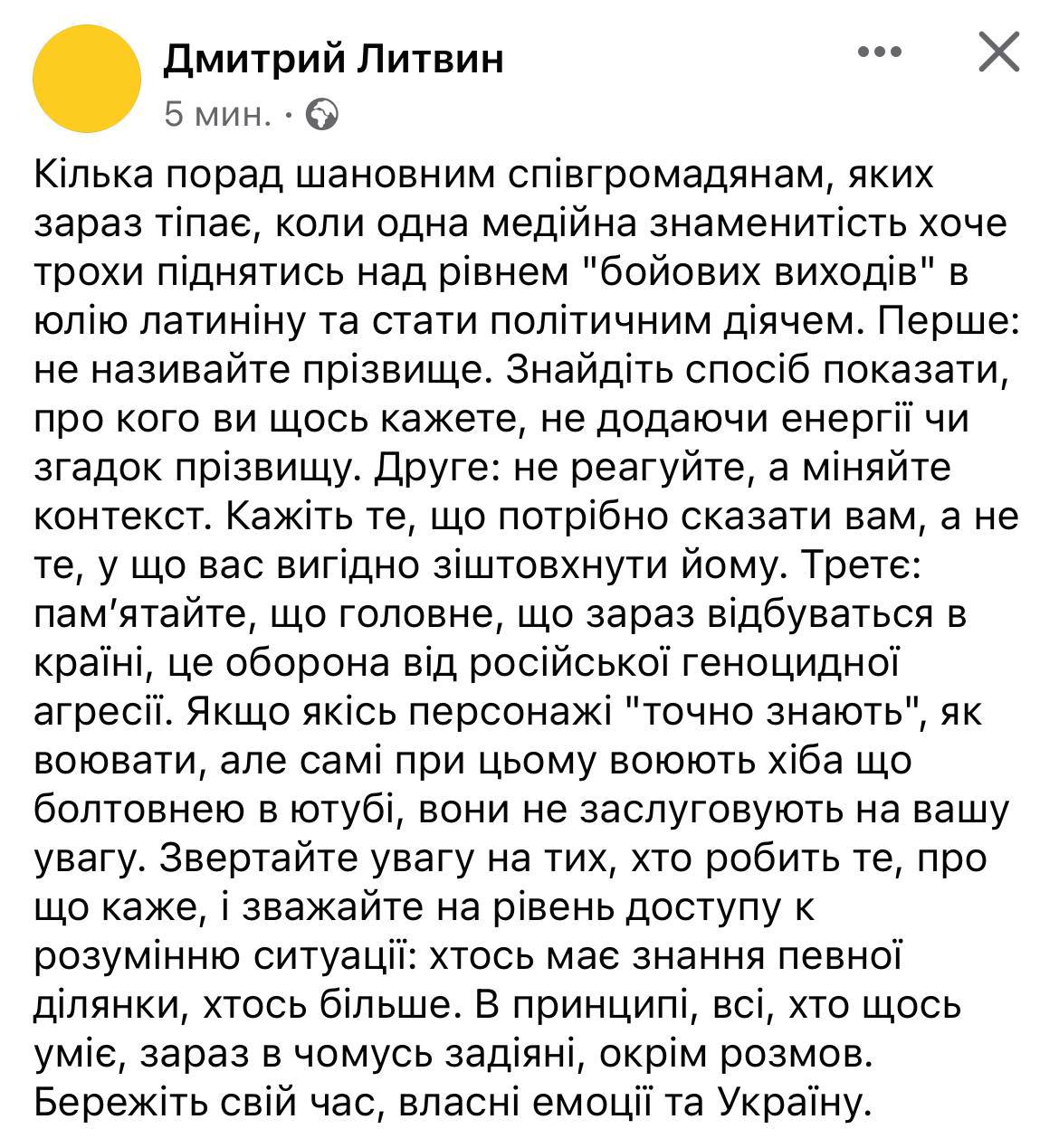 "Первое: не называйте фамилию. Найдите способ показать, о ком вы что-то говорите, не добавляя энергии или упоминаний фамилии", - написал Литвин.