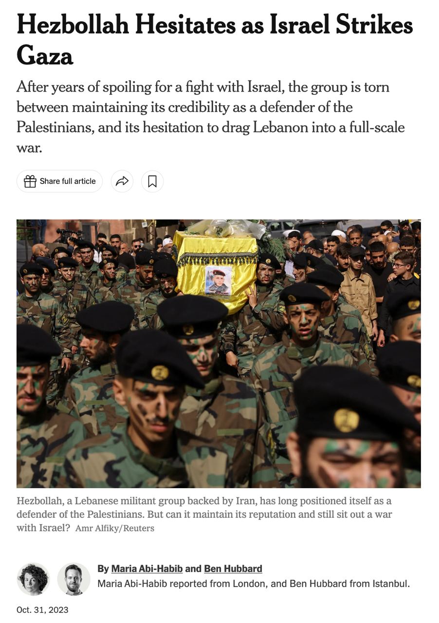 Ливанский чиновник, разговаривавший с "Хезболлой", сказал изданию, что это движение назвало своей красной линией для вмешательства уничтожение ХАМАС. Организация готова вступить в войну, если палестинская группировка будет "на последнем издыхании".