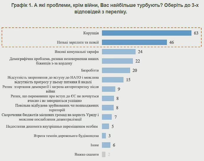 О коррупции заявили 63% опрошенных. На второе место (не считая войны) среди проблем они поместили низкие зарплаты и пенсии - на них пожаловались 46% опрошенных.