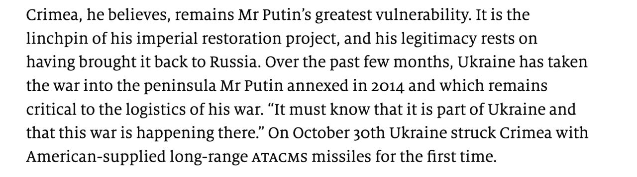 Главком считает полуостров "самым уязвимым местом Путина", "стержнем его проекта восстановления империи", имеющим "решающее значение для логистики его войны". Поэтому Украина намерена атаковать Крым все чаще.
