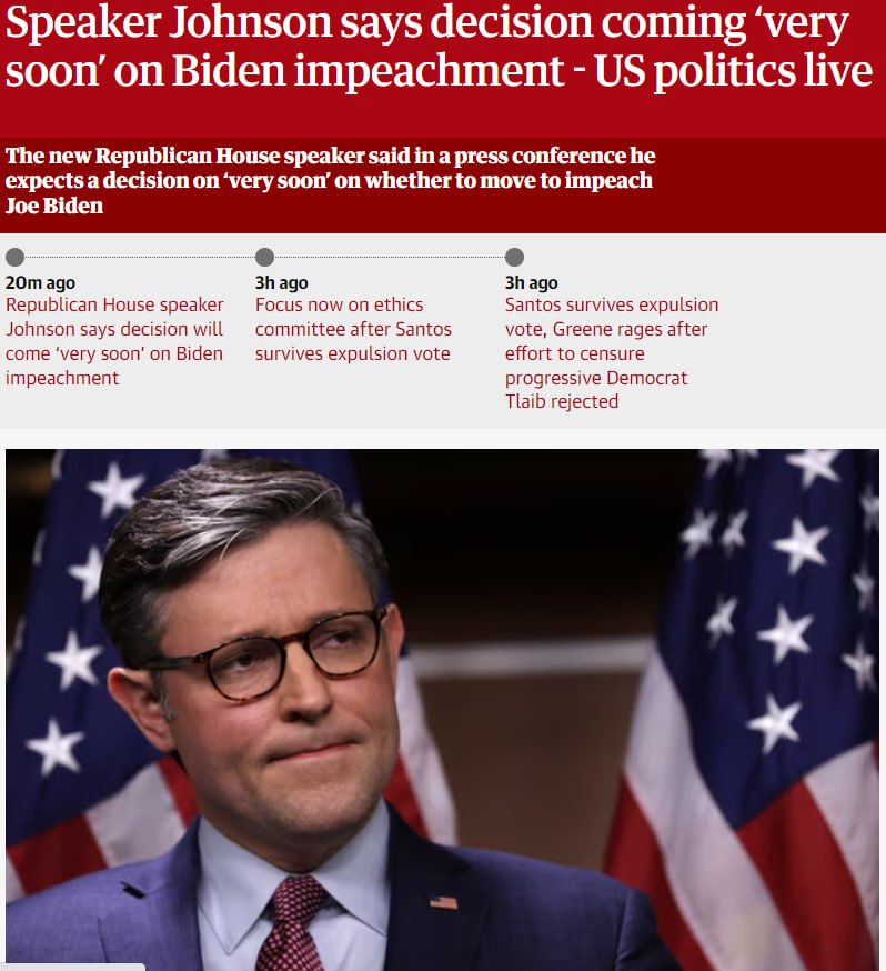 Спикер палаты представителей Майк Джонсон заявил, что очень скоро будет принято решение об импичменте президента Джо Байдена.