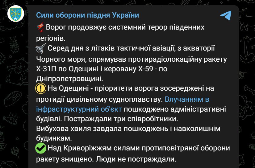 В записи сказано, что в Одесской области есть попадание в инфраструктурный объект, повреждены административные здания. Пострадали три сотрудника. Взрывная волна нанесла повреждения окрестным домам.