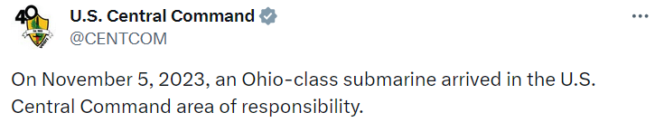 "5 ноября 2023 года в зону ответственности Центрального командования США прибыла подводная лодка класса "Огайо", - говорится в сообщении.