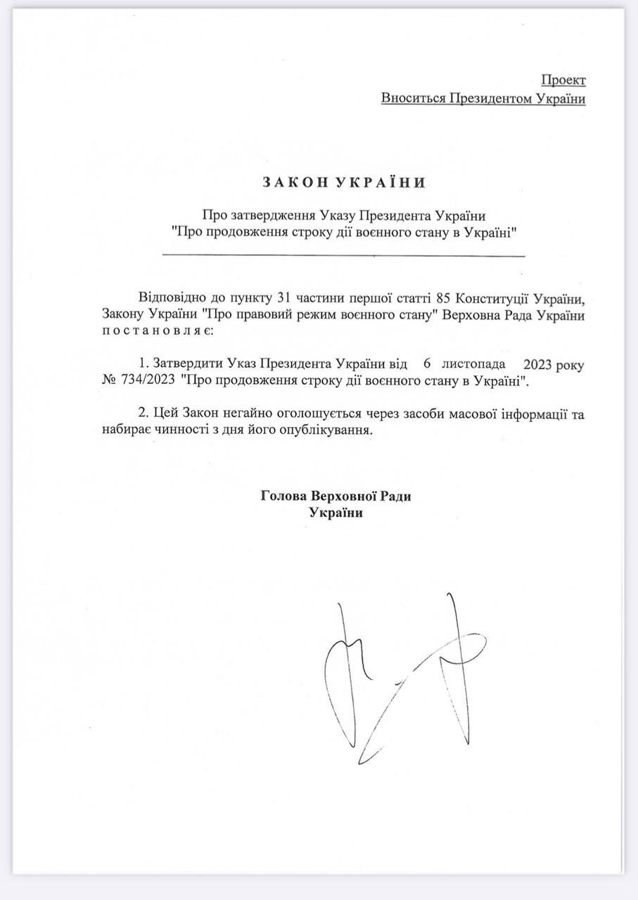 Владимир Зеленский внес в парламент закон о продлении военного положения и мобилизации еще на 90 дней - до 14 февраля 2024 года.