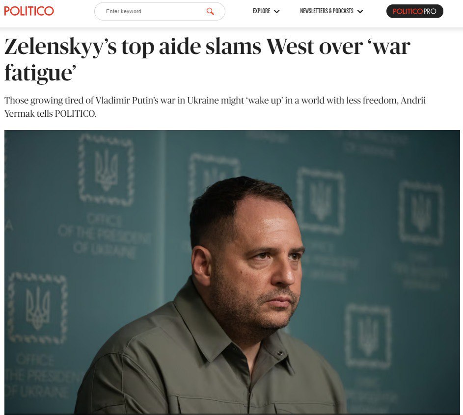 Глава Офиса президента Андрей Ермак в комментарии изданию Politico раскритиковал Запад за "усталость от войны".