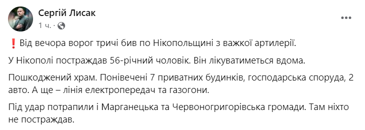 "С вечера враг трижды бил по Никопольщине из тяжелой артиллерии. В Никополе пострадал 56-летний мужчина. Он будет лечиться дома", - написал он.