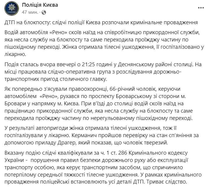 "Как предварительно выяснили правоохранители, 66-летний мужчина, управляя автомобилем "Рено", двигался по Броварскому проспекту со стороны г. Бровары в направлении г. Киева. При въезде в столицу водитель совершил наезд на работницу пограничной службы, которая несла службу на блокпосту и как раз переходила проезжую часть по нерегулируемому пешеходному переходу", - говорится в сообщении.